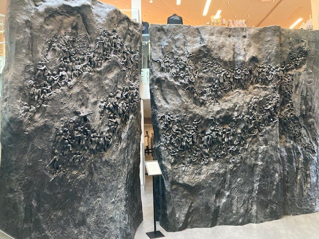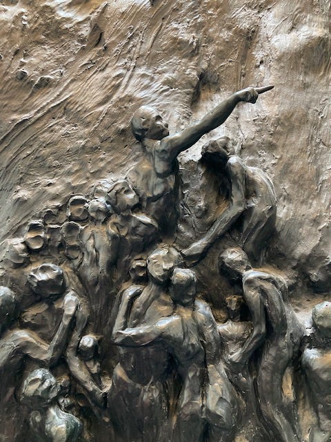 Back in January I was in Memphis for a conference, and toured the National Civil Rights Museum at the Lorraine Motel. One of the first things you see in the atrium is a huge bronze sculpture titled “Movement to Overcome” by Texas artist Michael Pavlovsky. Hundreds of human figures work together to scale a steep rocky mountain wall.